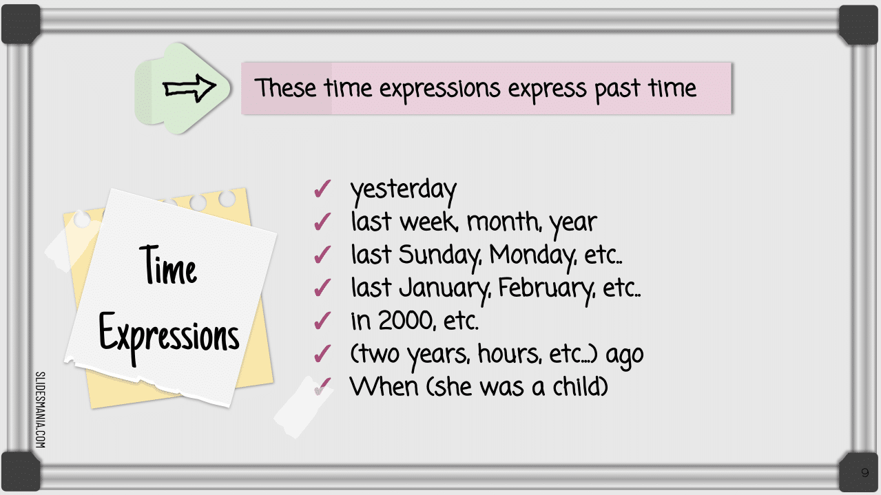 Download this presentation and make your own copy here! Table of Contents ToggleUsesCompleted actionsHabits or routine actionsLong actions A series of actionsIn conditional sentencesFormsAffirmative sentencesNegative sentencesQuestionsTime markersUsed to UsesPast simple verbs express actions that started and completed in the past. They may indicate:(1) actions that happened and completed sometime in the past,(2) actions that frequently happened in the past,(3) actions that lasted for a period of time in the past,(4) a series of actions in the past, or(5) imaginary conditions.Let’s explain each one of these situations with illustrations and example sentences. Completed actionsA single action that started and finished sometime in the past is expressed with a past simple verb. Examples:She opened her first bank account when she was 16.We bought our house 10 years ago.I visited the dentist yesterday.He broke his leg last week. Habits or routine actionsThese are actions that frequently happened in the past, but they no more happen in the presentAdverbs of frequency can be used to indicate the routine action or habit. Examples:When I was in high school, I wore a school uniform.She never wanted to be in a big crowd.When he was little, he didn’t like dogs.She worked as a journalist after school. Long actionsThe past simple tense is used to talk about actions that lasted for a period of time in the past. They no more happen in the present. Examples:I lived in Italy for five years.They studied German for ten months.He worked on the project the whole week.She played the piano all day. A series of actionsMore than one action in a series that took place and finished in the past are described using past simple verbs. Examples:In the morning, I prepared the kids’ breakfast, cleaned the kitchen, and made some phone calls.They arrived at the airport, took a taxi, and called us to meet them at the hotel.She baked a cake, set the table, and invited everybody. In conditional sentencesIn conditional sentences, specifically if clause type 2, we use past simple verbs to talk about imaginary or unreal conditions. Examples:If I were a school principal, I would give the students longer weekends.What would you do if you inherited a big fortune?If she knew his name, she would tell us. FormsAffirmative sentencesThe past tense of the verb (or Verb 2) is used to describe something in the past. The same form is used with all persons.I traveled twice last year.We traveled twice last year.You traveled twice last year.They traveled twice last year.She traveled twice last year.He traveled twice last year.It traveled twice last year.Past verbs fall into 2 groups: regular and irregular verbs.Regular verbs are formed by adding ed or d to the base verb.Irregular verbs follow different patterns.(Check a list of regular and irregular verbs here.) Negative sentencesTo make the negative of past tense verbs, we use the auxiliary did + not and the base verb.Subject + did not (didn’t) + base verb Examples:They did not move to the city last year.She didn’t present her project in class.I didn’t wash my car on Friday.You did not add sugar to my tea. QuestionsTo make questions, we use the auxiliary verb did.Yes/No Questions Did + subject + base verb?Wh-Questions: Wh-word + did + subject + base verb? Examples:Did they finish the course on time?When did he arrive?Did you learn French when you were in France?Where did you call Tina? Time markersAny expression of time that refers to a time before the time of speaking can be used with past tense verbs.yesterdaylast night, in the morning, last evening, etc.last week, last month, last year, etc.an hour ago, two days ago, etc.in 1990, in January, on Sunday, etc.when I was a child Used toUsed to is used to talk about past habits that stopped to happen in the present.The same form is used with all persons, singular and plural. It is followed by the base verb.The sentence:Nadeen used to wear a uniform at work.means that she no more wears a uniform now.To form the negative, we use: Subject + did not (didn’t) use to + base verb. She didn’t use to drink coffee in the morning.To form questions, we use: (Wh) did + subject + use to + base verb …?Did you use to go to school by bus?What did Amy use to eat before she started her diet?Used to gives the same meaning of the past simple verbs that describe past habits. (Refer to usage 2 above.)These two sentences mean the same:They used to visit us every now and then.They visited us every now and then. ⇔ Take a quiz on Past Simple Tense! More resources on the Site:Grammar ExplanationsGoogle Slides for TeachersPresent Simple TensePast Perfect TensePast Simple and Present Perfect QuizPast Continuous and Past Simple QuizAdverbs of FrequencyExercisesTake a Quiz