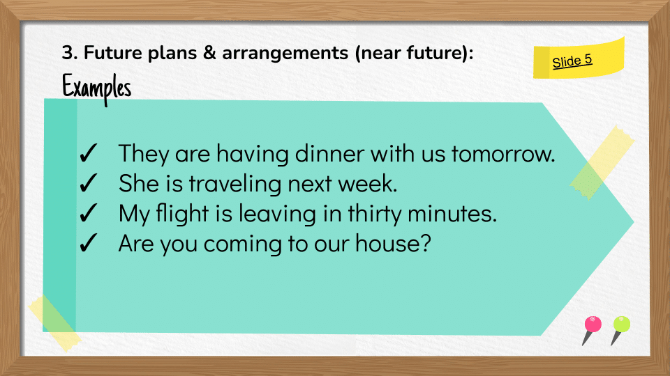 The present continuous can express planned near future actions. Future time markers are used to indicate the time.